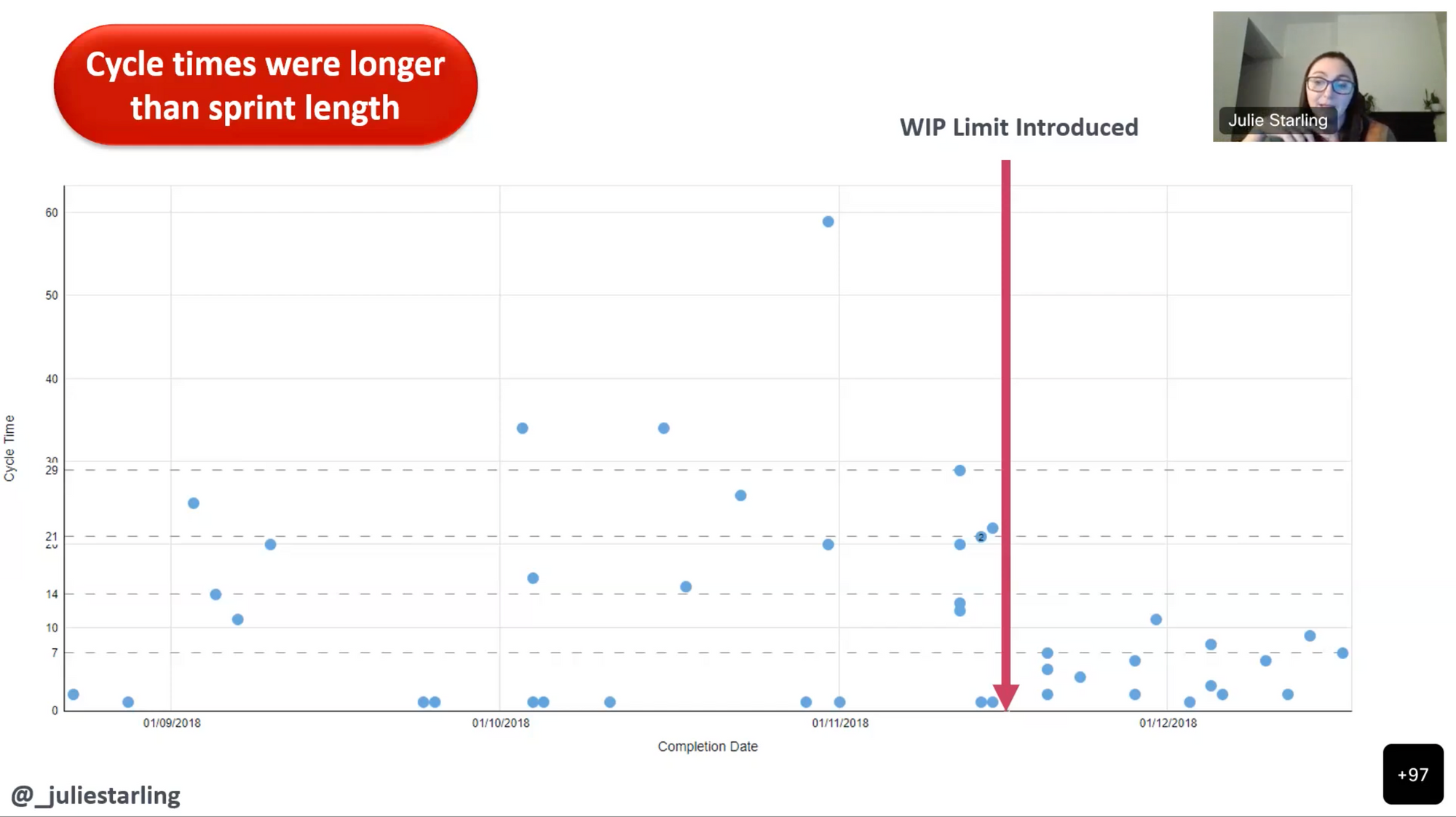 Julie shared her graphs of where they introduced WIP limits, and its impact clearly visible on the scatter plot.